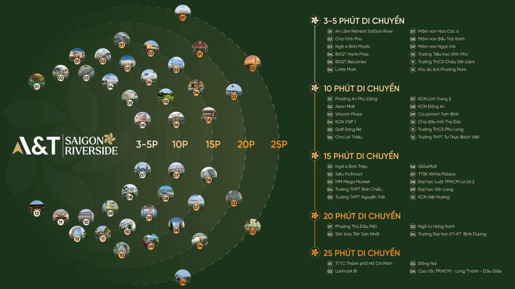 Từ vị trí dự án A&T Saigon Riverside di chuyển đến các tiện ích ngoại khu gần kề như: